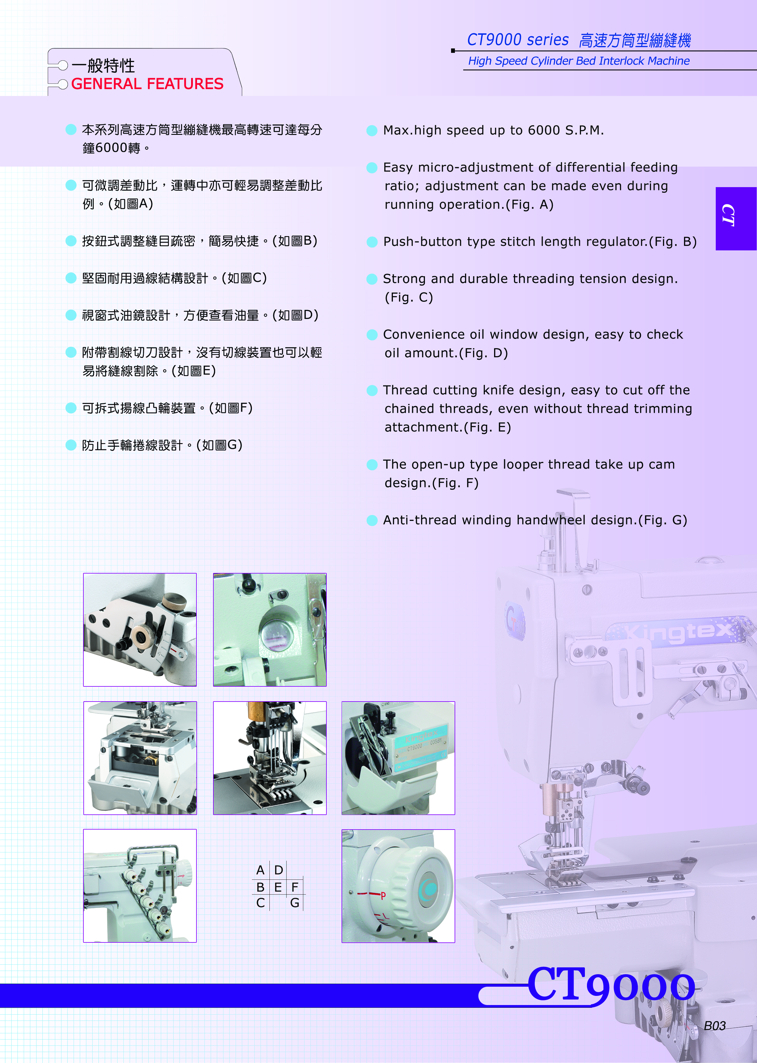 Thread cutting knife design, easy to cut off the chained threads, even without thread trimming attachment.(Fig. E)