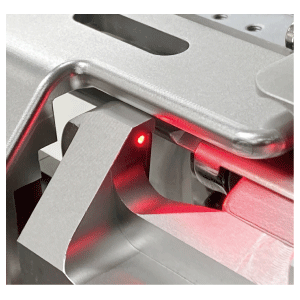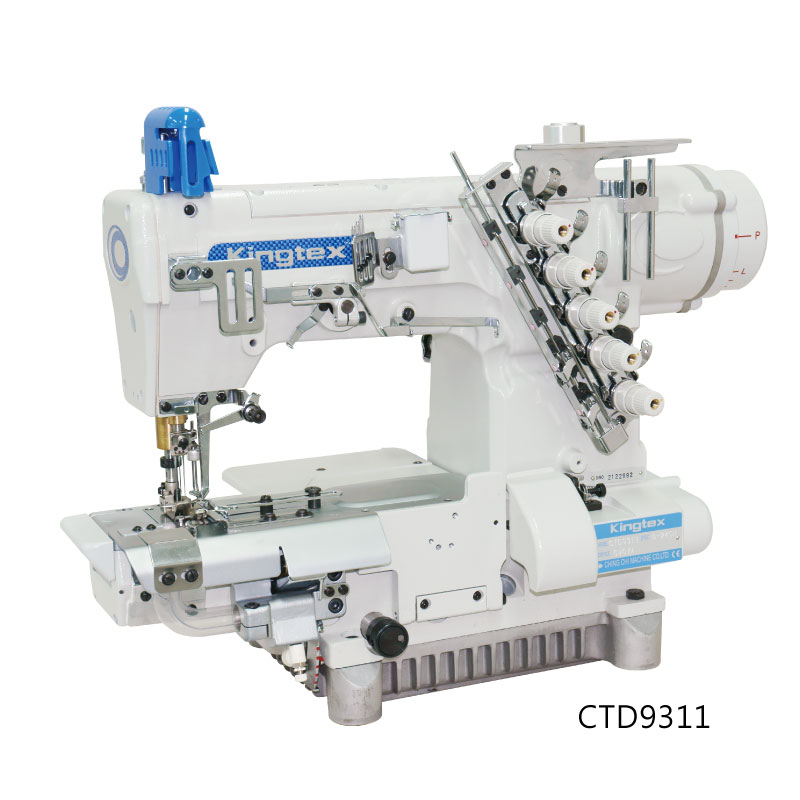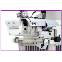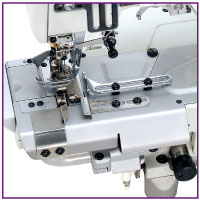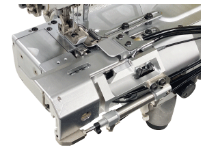 With hemming folder, left hand side fabric trimmer and fabric chips suction pipe, suitable for hemming operation on tubular fabric, such as cuff or bottom of T-shirt, polo shirt. The tubular fabric can be folded downward smoothly and the sewing operation continues while the folded fabric edge is trimmed by the left hand knife prior to sewing. In the meanwhile, fabric chips and dust can be sucked into the waste collection bag through the pipe.