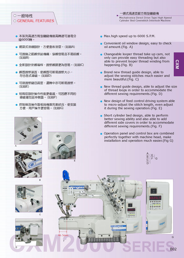Short cylinder bed design, able to perform better sewing ability and also able to add different side covers in order to accommodate different sewing requirements.(Fig. F)