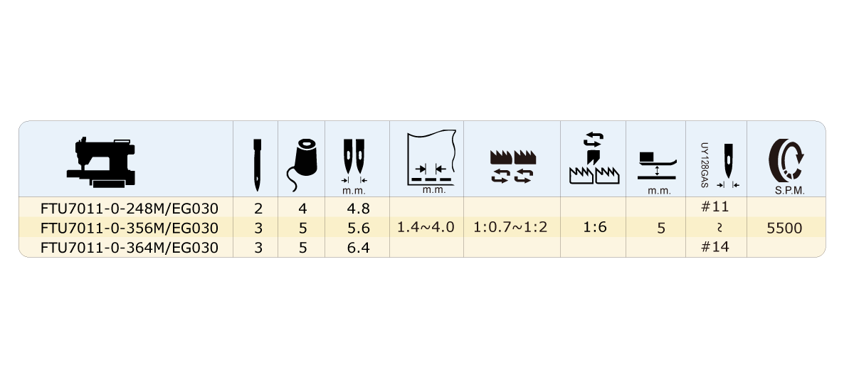 Since this unit is equipped with variable top feed mechanism, the fabrics can be fed and saw smoothly and this mechanism prevents fabrics from twisting during hemming operations.
