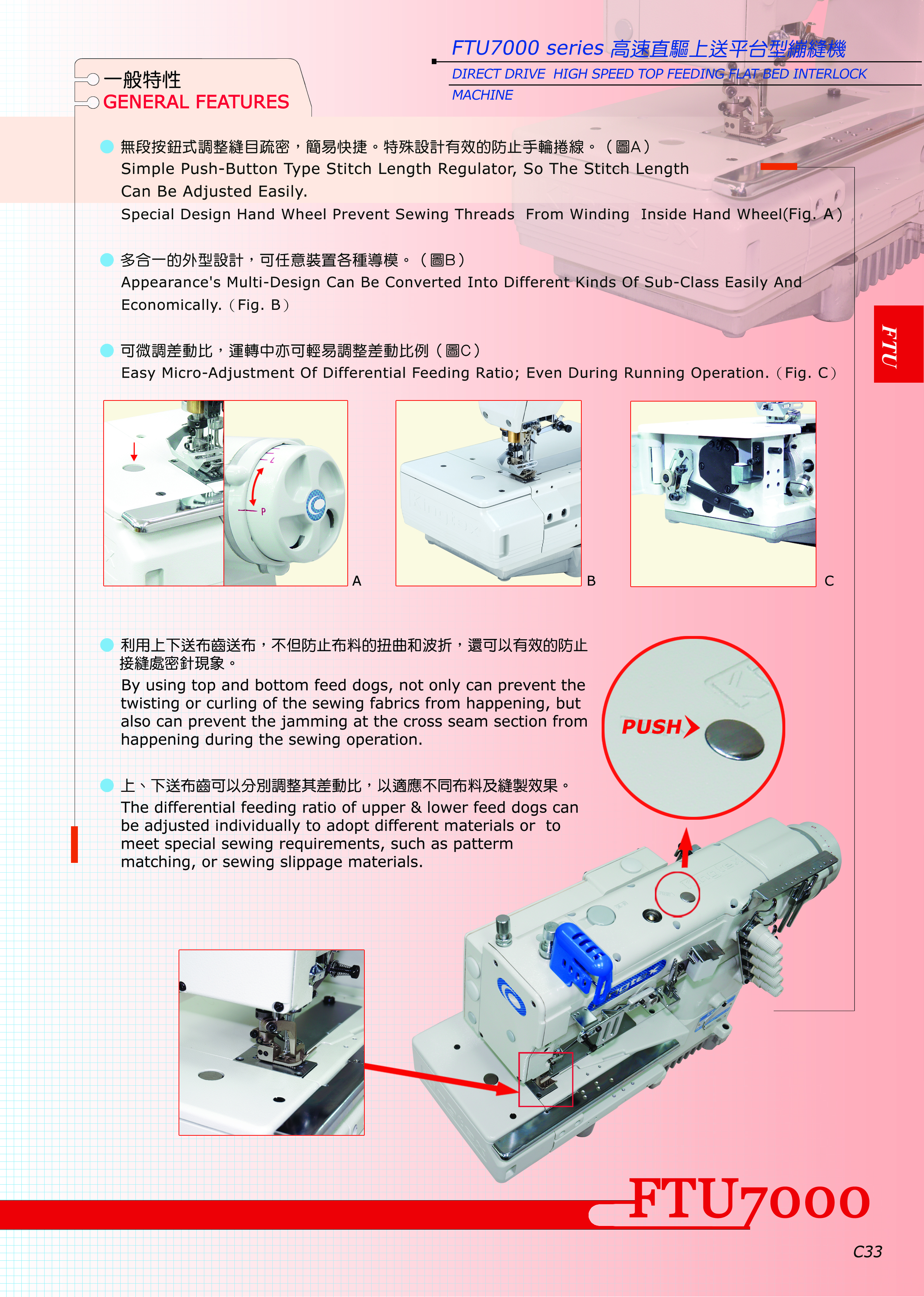 By using top and bottom feed dogs, not only can prevent the twisting or curling of the sewing fabrics from happening, but also can prevent the jamming at the cross seam section from happening during the sewing operation.