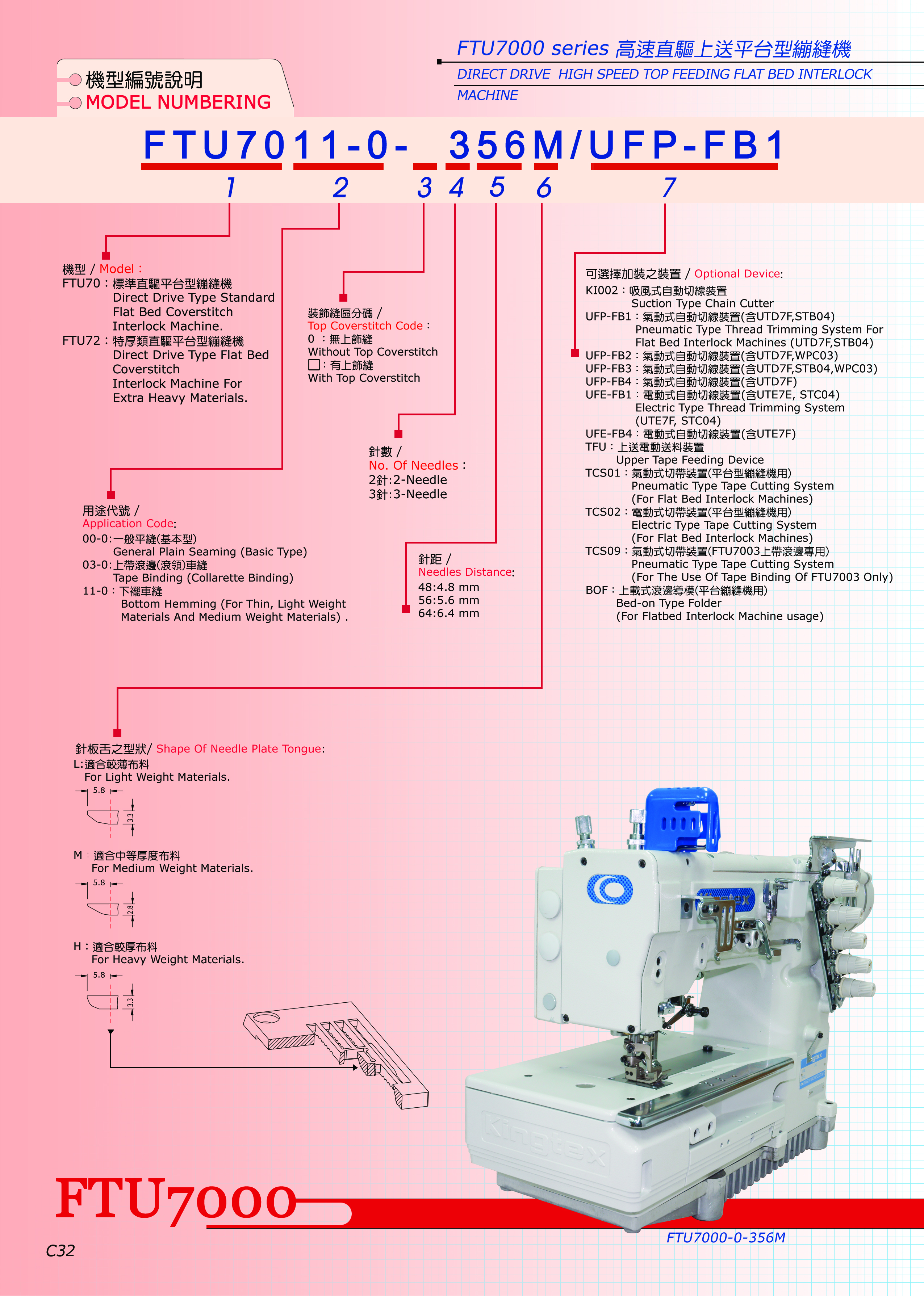UFP-FB2:Pneumatic Type Thread Trimming System For Flat Bed Interlock Machines(UTD7F, WPC03) UFP-FB3:Pneumatic Type Thread Trimming System For Flat Bed Interlock Machines(UTD7F, STB04, WPC03) UFP-FB4:Pneumatic Type Thread Trimming System For Flat Bed Interlock Machines(UTD7F) UFE-FB1 :Electric Under Bed Thread Trimming System(UTE7F, STC04)