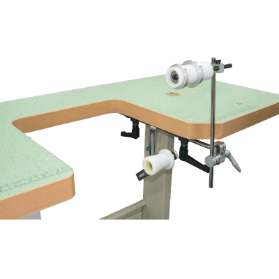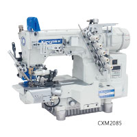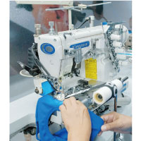 - 具有右切刀修布裝置,後拖輪,布屑導管及TR003裝置(擴張滾輪組) ,可將環狀平版寬幅鬆緊帶順暢地縫合在環狀褲頭之上,並由右切刀 將褲頭裁片之右緣修齊再行縫合在鬆緊帶下方,而右切刀修布之同時 ,布屑則由吸風裝置或壓縮空氣,經吸布屑導管吸出。