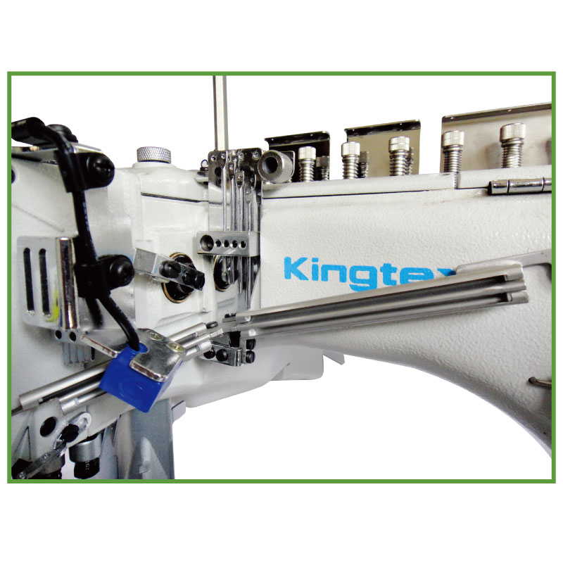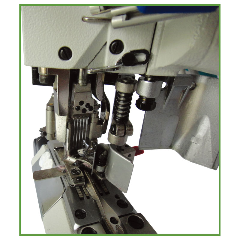 - 雙切布片在疊合時,因布料條件(厚度,彈性…等),需有對應的壓腳溝槽,壓腳鞋,壓腳舌,切刀,中分規…等配套,以順暢完成車縫。