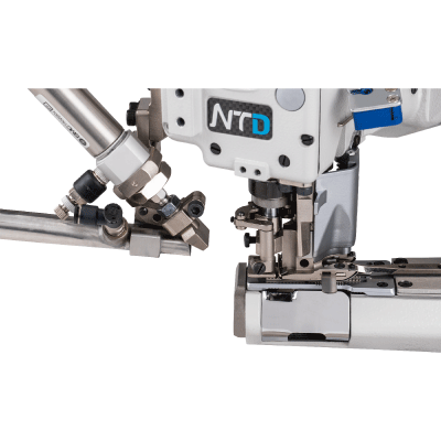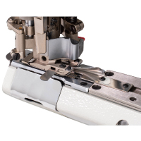 - 雙切布片在疊合時,因布料條件(厚度,彈性…等),需有對應的壓腳溝槽,壓腳鞋,壓腳舌,切刀,中分規…等配套,以順暢完成車縫。