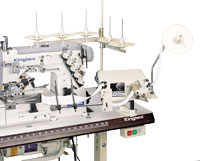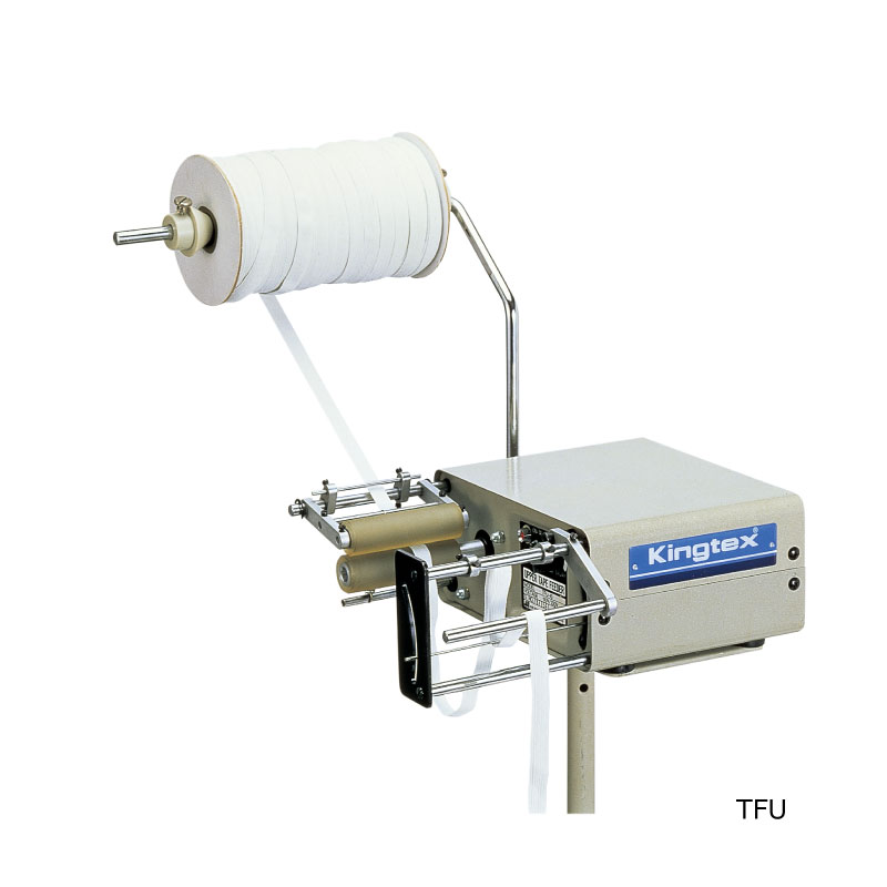 - 在鬆緊帶或針織布帶進入張力控制裝置之前,確保其為無張力狀態,有上送型 TFU 與側送型 TFS 可供選擇,最大適用寬度 70 mm。