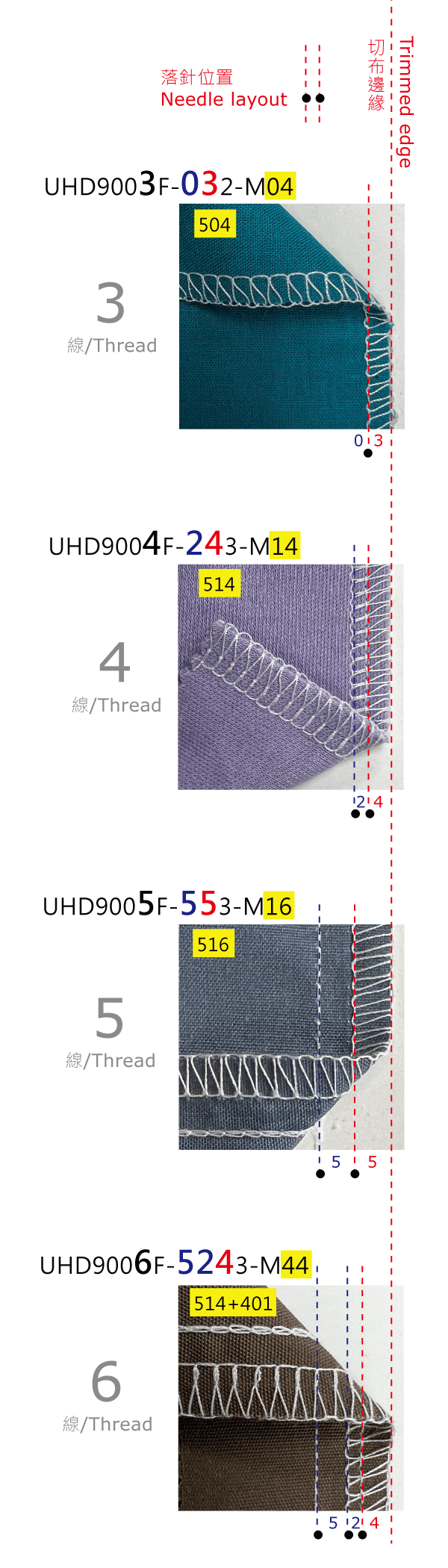 功能代碼 | 三電眼 | 切刀 | 抬壓腳 | *吸風集屑 | 鬆線 | 操作面板 | 針板 | 備註 |