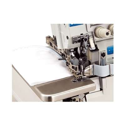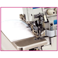 - 本機型為雙針雙勾針二重環鏈式線跡,搭配布帶喇叭,可車縫大衣或西褲的口袋滾邊。