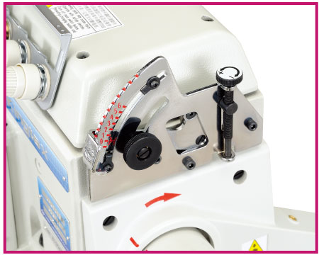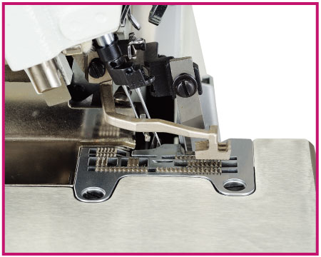 此機型較一般機型多一組上送具機構,其上送布齒裝設於針的前方,可確保上、下裁片送布量均勻,避免車縫結束後,上、下裁片長短不一樣或起皺最適合車縫,滑之布料,上、下裁片伸縮性不同的車縫作業以及須對花、對格之縫裝要求。
